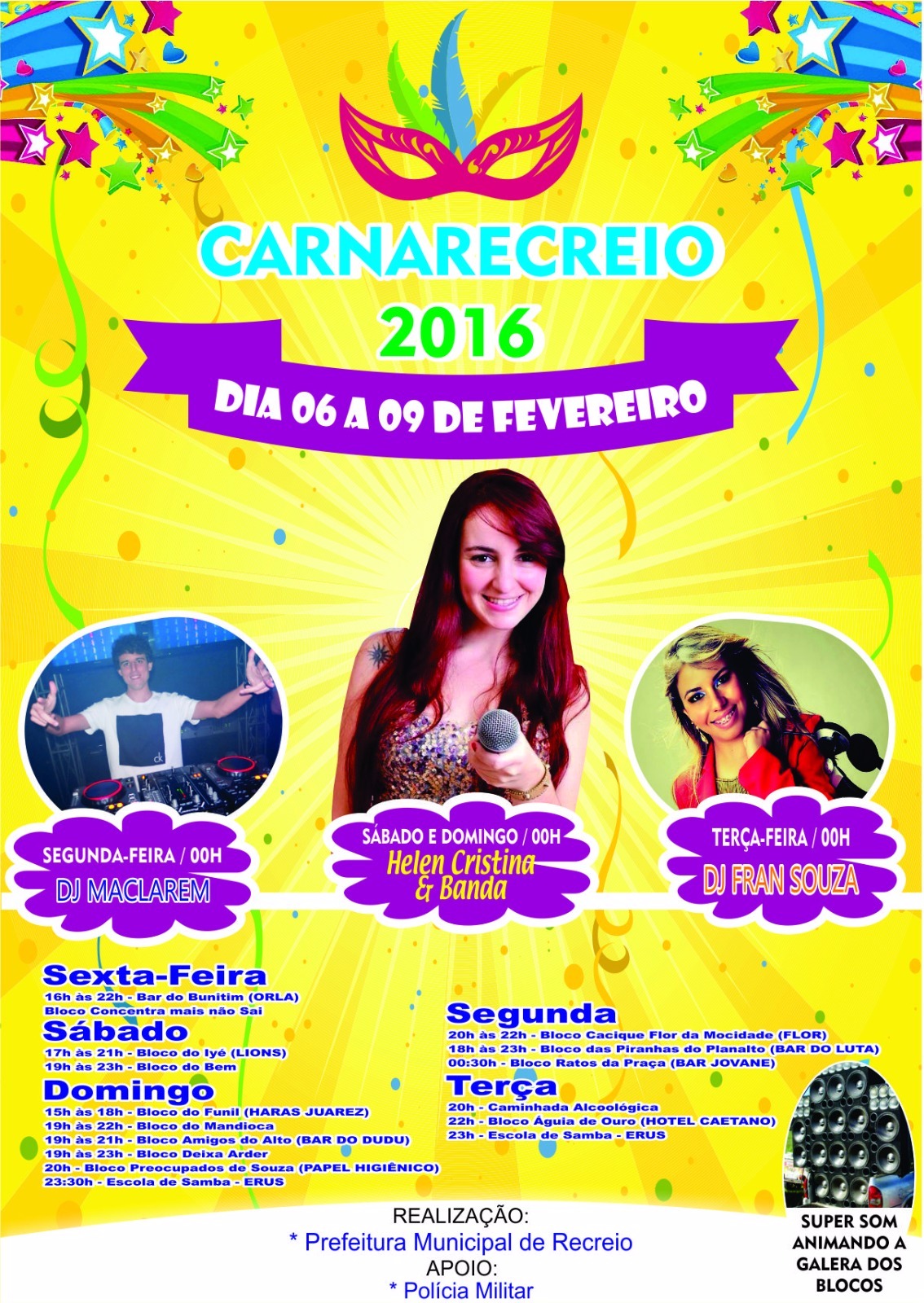 Faltando apenas uma semana para a festa mais popular de Recreio, finalmente, a programação oficial foi divulgada e a principal atração será a cantora “Hellen Cristina & Banda”, da cidade de Santo Antônio de Pádua (RJ), com apresentações marcadas para o sábado e o domingo. Nos outros dias o palco ficará por conta de DJ’s.