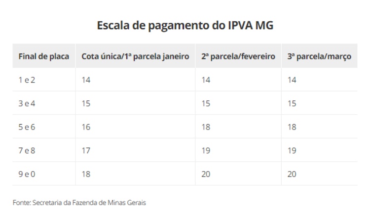 A primeira parcela do IPVA/2019 para veículos de placas de final 1 e 2 em Minas Gerais vence nesta segunda-feira (14). (Veja abaixo a escala de pagamentos).