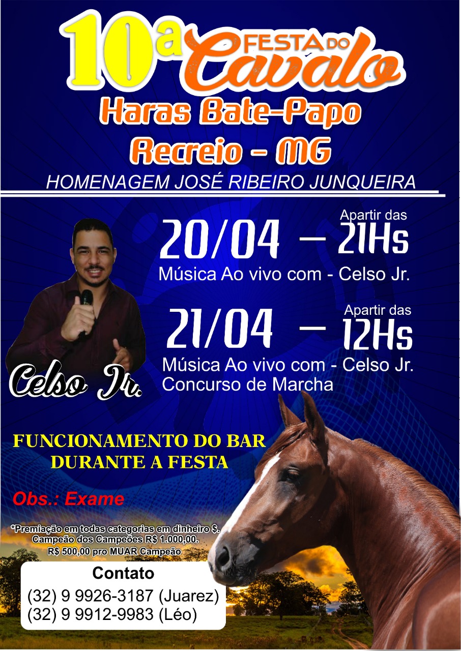 Um dos maiores concursos de marcha da região – Festa do Cavalo do Haras Bate-Papo de Recreio –, acontece nos dias 20 e 21 de abril. A 10ª edição homenageará José Ribeiro Junqueira, o popular Zé Birão, grande criador de cavalos do Haras Sama, atual Fazenda São Mateus.