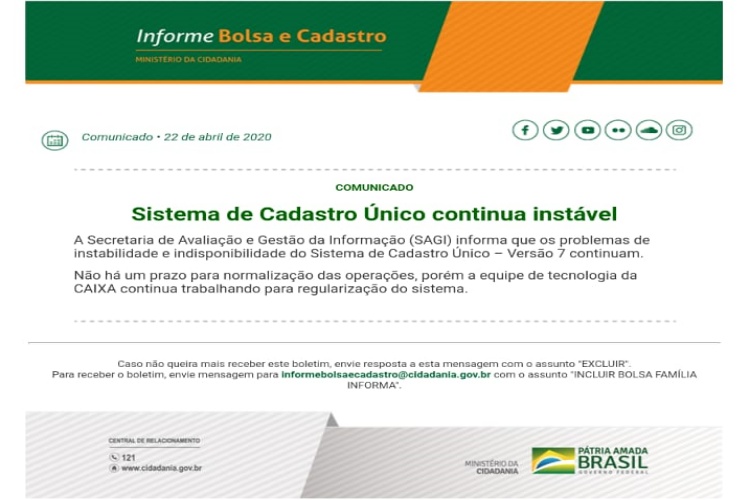 O sistema do Cadastro Único continua indisponível, conforme informações do Ministério da Cidadania ao Centro de Referência de Assistência Social de Recreio “CRAS”. A indisponibilidade já dura aproximadamente 15 dias.
