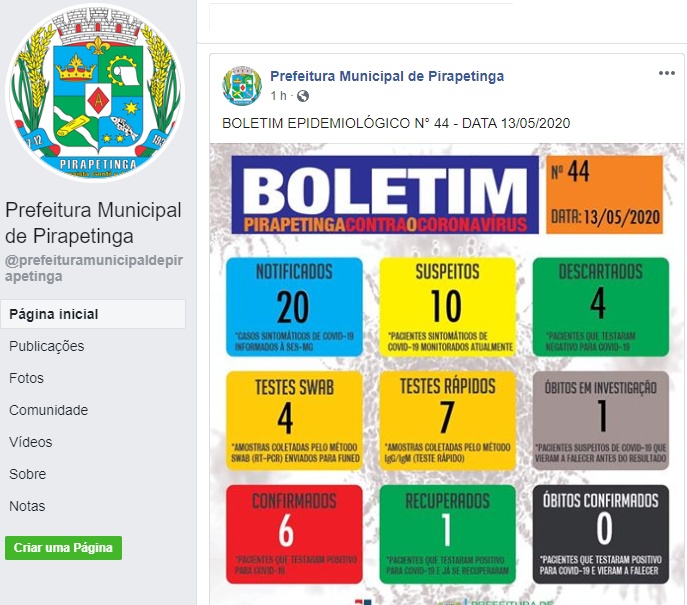 Em calamidade pública reconhecida pela Assembleia Legislativa de Minas Gerais “ALMG”, a cidade de Pirapetinga, com 10.752 habitantes (IBGE/2019), chegou a 6 casos positivos do novo coronavírus. No boletim epidemiológico desta quarta-feira (13) a Prefeitura Municipal de Pirapetinga informou que um paciente está recuperado da doença.