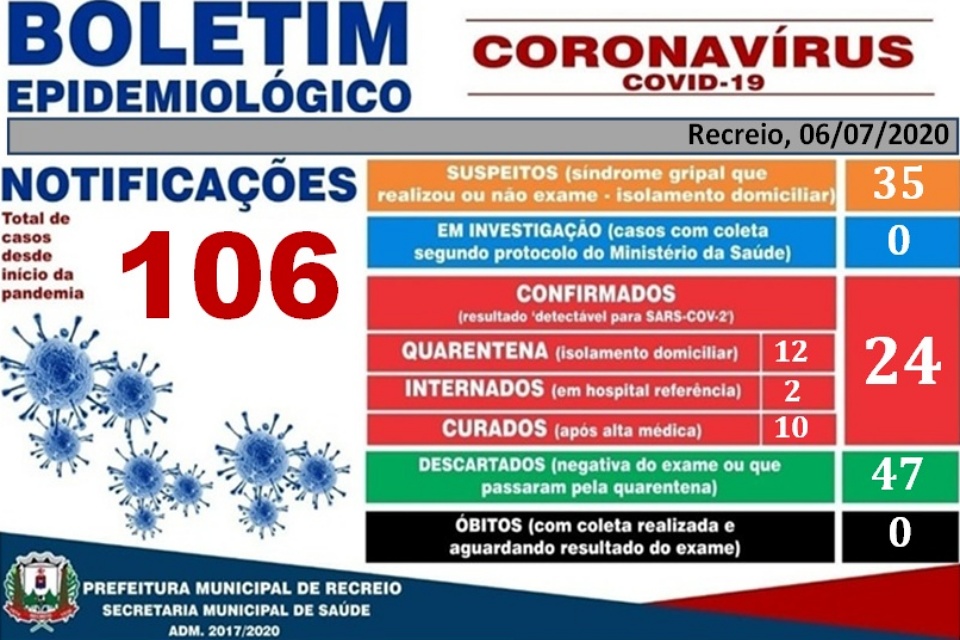 Até a data de hoje Recreio tem 35 casos suspeitos, com síndrome gripal que realizaram ou não exame e que estão em isolamento domiciliar; e 47 descartados. Dos 14 que ainda estão com a Covid-19, 12 estão em isolamento domiciliar e 2 internados em hospital referência.