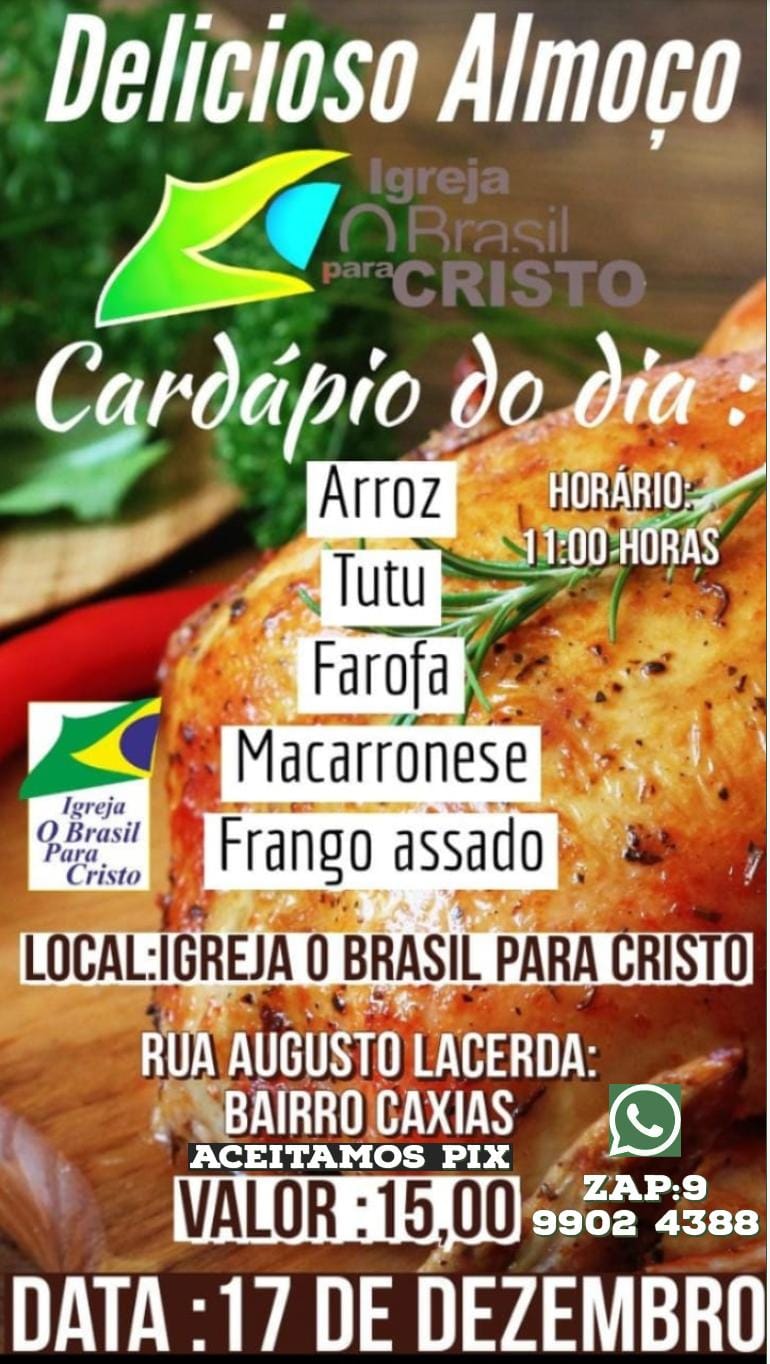 Neste domingo (17) tem um delicioso almoço da “Igreja O Brasil para Cristo”, localizada à Rua Augusto Lacerda, no bairro Caxias, a partir das 11h. O valor é R$ 15.
