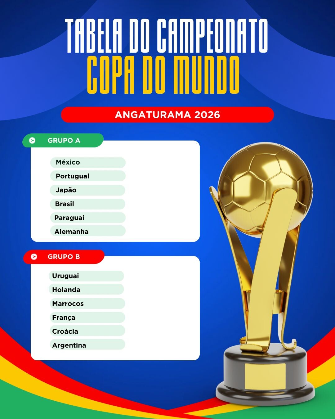 Começou no último domingo (1), mais uma edição da Copa de Angaturama. Na edição de 2026, os times têm nomes em alusão às seleções da Copa do Mundo de Futebol. Os jogos acontecem aos domingos, a partir de 12:30h.