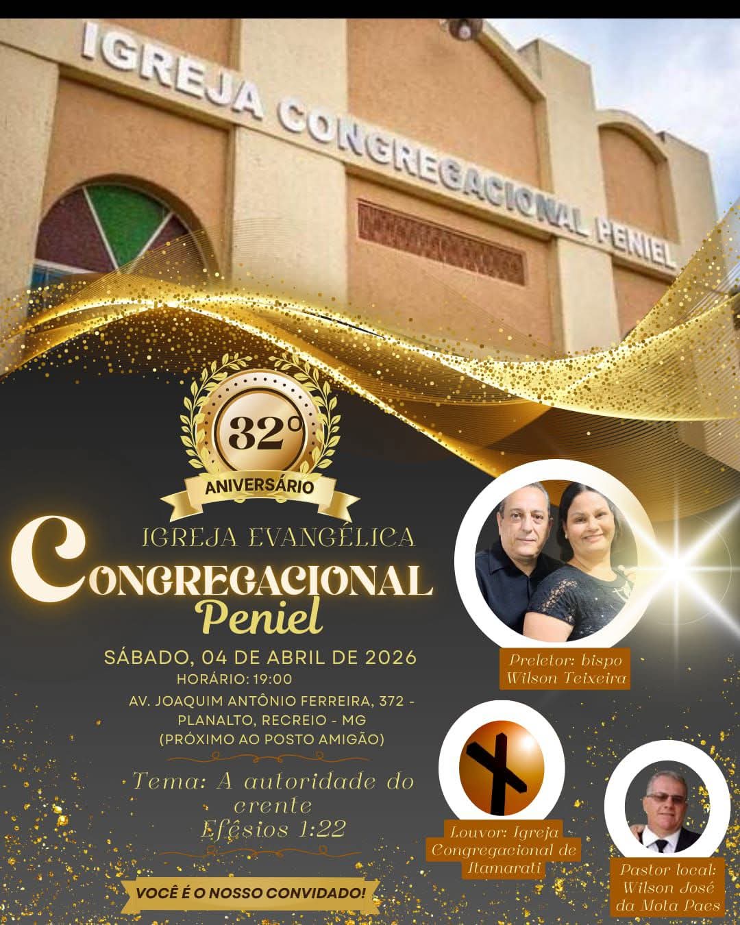 A Igreja Congrecional Peniel de Recreio vai comemorar 32 anos, neste sábado (4), com culto às 19h, no templo localizado à Avenida Joaquim Antônio Ferreira, no bairro do Planalto.