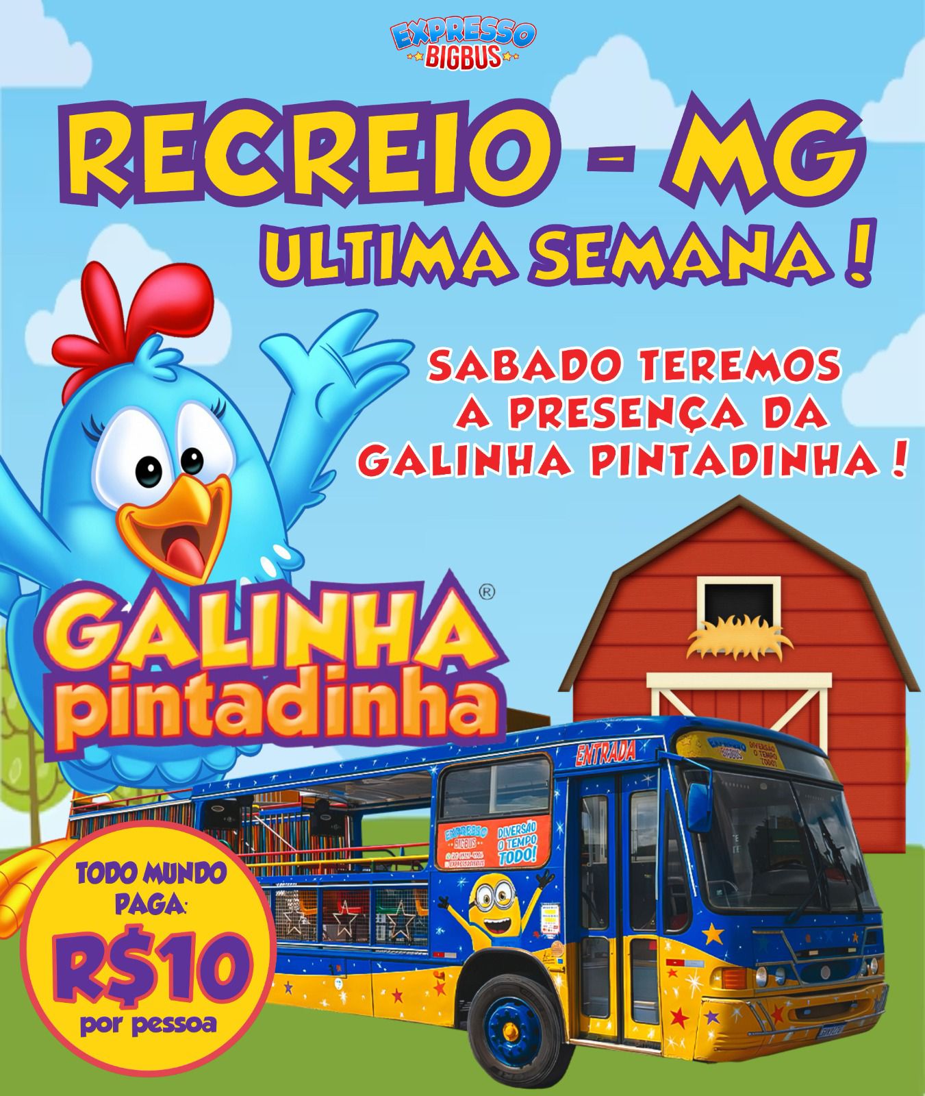 Neste sábado (18), a partir das 17:30h, tem diversão em Recreio com o Expresso BigBus com passeios pela cidade acompanhados de personagens.